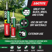 LoctiteĀ® PLĀ® 500 Landscape Construction Adhesive is a heavy-duty, weather-resistant adhesive designed for a wide range of landscaping projects. Ideal for contractors and DIY landscapers alike, it securely bonds materials like brick, stone, timber, and concrete—even in challenging weather conditions—making your outdoor projects durable and long-lasting.
