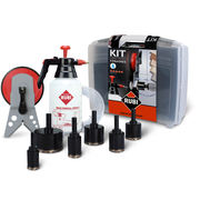 The RUBI FORAGRES Diamond Drill Bits Kit is a professional-grade wet drilling solution designed for clean, precise holes in porcelain, ceramic, granite, marble, and stoneware tile. Ideal for contractors and tile installers, this complete kit includes high-performance diamond bits, a MULTIDRILL guide system, and a manual water pump for optimal cooling and extended bit life.