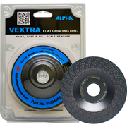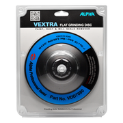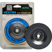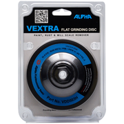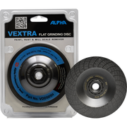Alpha Vextra Flat Disc is a grinding disc designed for steel, stainless steel, non-ferrous metals, and general-purpose surface preparation. It is used for material removal, rust removal, paint stripping, and grinding epoxy, glues, and adhesives without clogging the grinding surface.