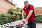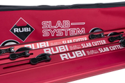 The RUBI SLAB CUTTER G3 is a manual cutting system designed for accurate scoring and separation of large-format porcelain tiles. The lightweight red aluminum G3 guides improve handling while maintaining stability and feature an updated coupling system for secure alignment. The system is intended for manual cutting applications and is not compatible with the TC-125 electric saw.